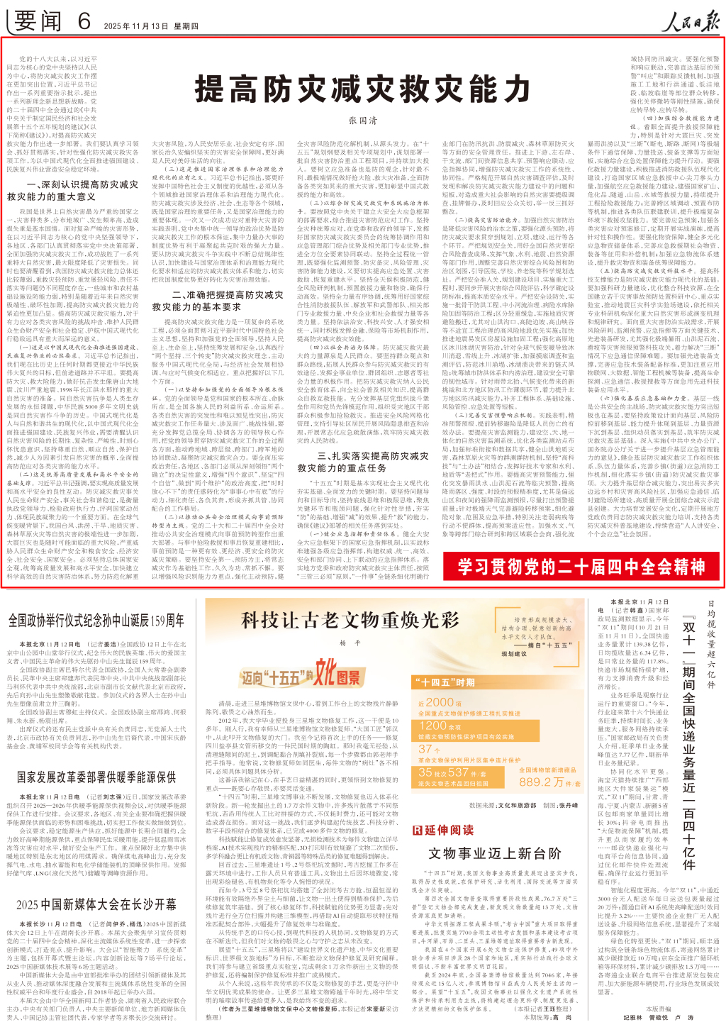党的十八大以来,以习近平同志为核心的党中央坚持以人民为中心,将防灾减灾救灾工作摆在更加突出位置,习近平总书记作出一系列重要指示批示,提出一系列新理念新思想新战略。党的二十届四中全会通过的《中共中央关于制定国民经济和社会发展第十五个五年规划的建议》(以下简称《建议》),对提高防灾减灾救灾能力作出进一步部署。我们要认真学习领会、抓好贯彻落实,针对性强化防灾减灾救灾各项工作,为以中国式现代化全面推进强国建设、民族复兴伟业营造安全稳定环境。